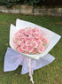 Pictured is a pink variety of 48 roses gift wrapped.
