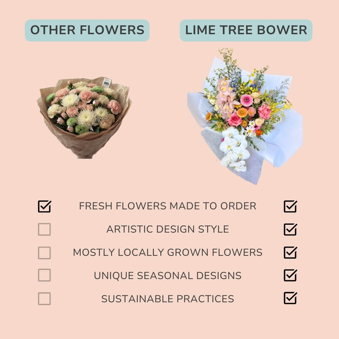 Every bouquet is bespoke, designed by our talented team in Northbridge using predominently locally sourced flowers