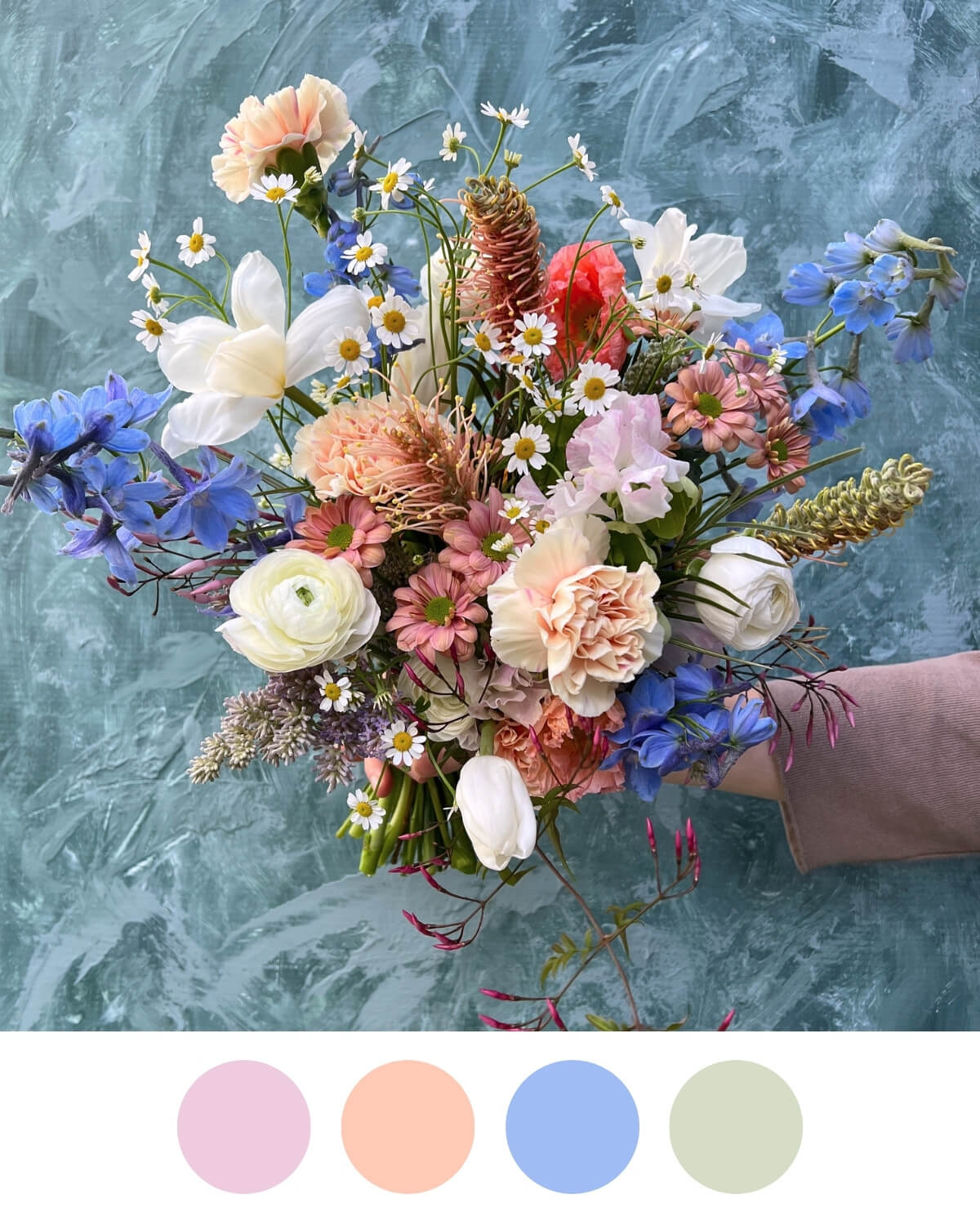 We usually finalise all the design details with you a couple weeks out, and then source the blooms in the week of your wedding. We hand-select the freshest seasonal flowers (often at the flower market just a day or two before the wedding). All the arranging and bouquet-making is done as close to the wedding day as possible to ensure everything is at peak freshness.